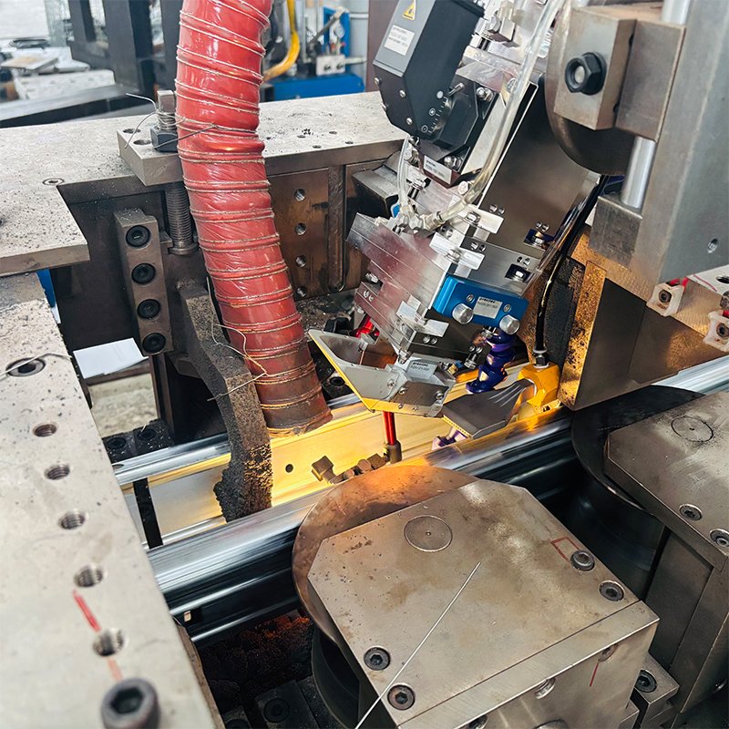 焊接質(zhì)量直接決定防撞梁結(jié)構(gòu)強(qiáng)度,生產(chǎn)線配置 2 臺(tái)德國(guó)通快激光焊接機(jī)雙機(jī)聯(lián)動(dòng)。主焊槍負(fù)責(zé)深熔焊接保障強(qiáng)度,擺動(dòng)焊頭處理邊角接縫,在線視覺(jué)檢測(cè)系統(tǒng)實(shí)時(shí)捕捉焊縫缺陷,確保焊接強(qiáng)度達(dá)母材 85% 以上。追剪切斷臺(tái)采用伺服同步控制,高速切斷精度達(dá) ±0.5mm,滿足批量生產(chǎn)的尺寸一致性要求。